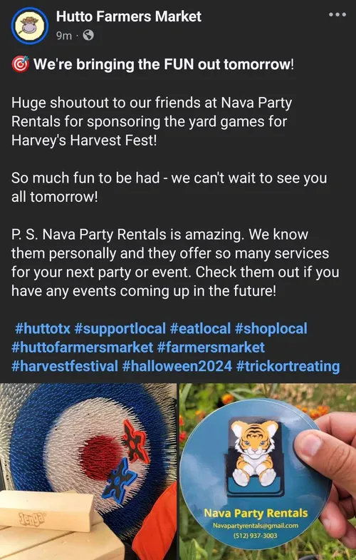 We’re proud to sponsor the Hutto Farmers Market and bring a little extra fun to the community! At Nava Party Rentals, we believe in supporting local events that make a difference, and we're excited to provide games that everyone can enjoy.